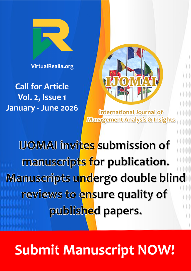 The International Journal of Management, Analysis and Insights (IJOMAI) is a peer-reviewed, open-access scholarly journal published by VirtualRealia.Org. The journal publishes original research in the field of management and related disciplines. It provides a platform for academics, practitioners, and policymakers.